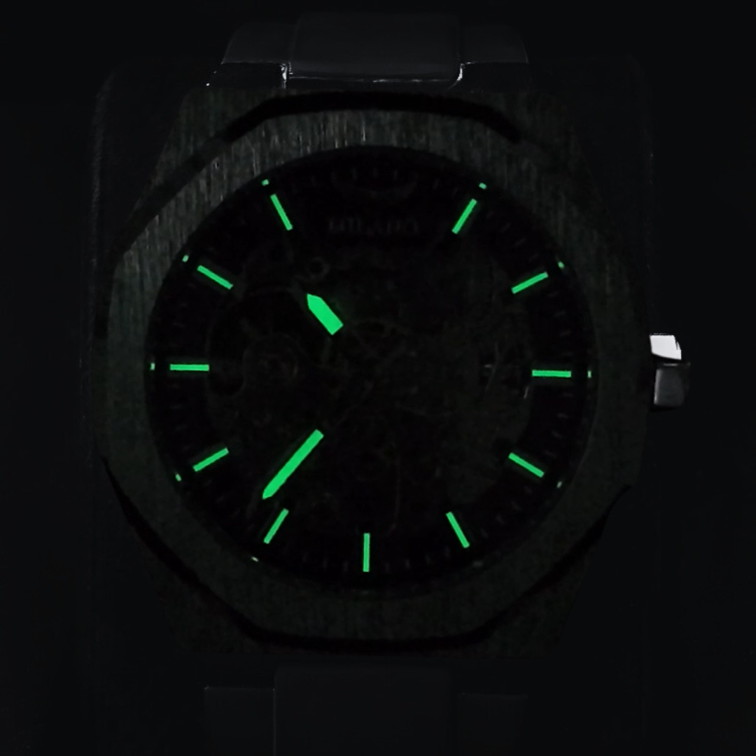 Material luminescente garante visibilidade no escuro. Seu brilho ilumina os ponteiros.
