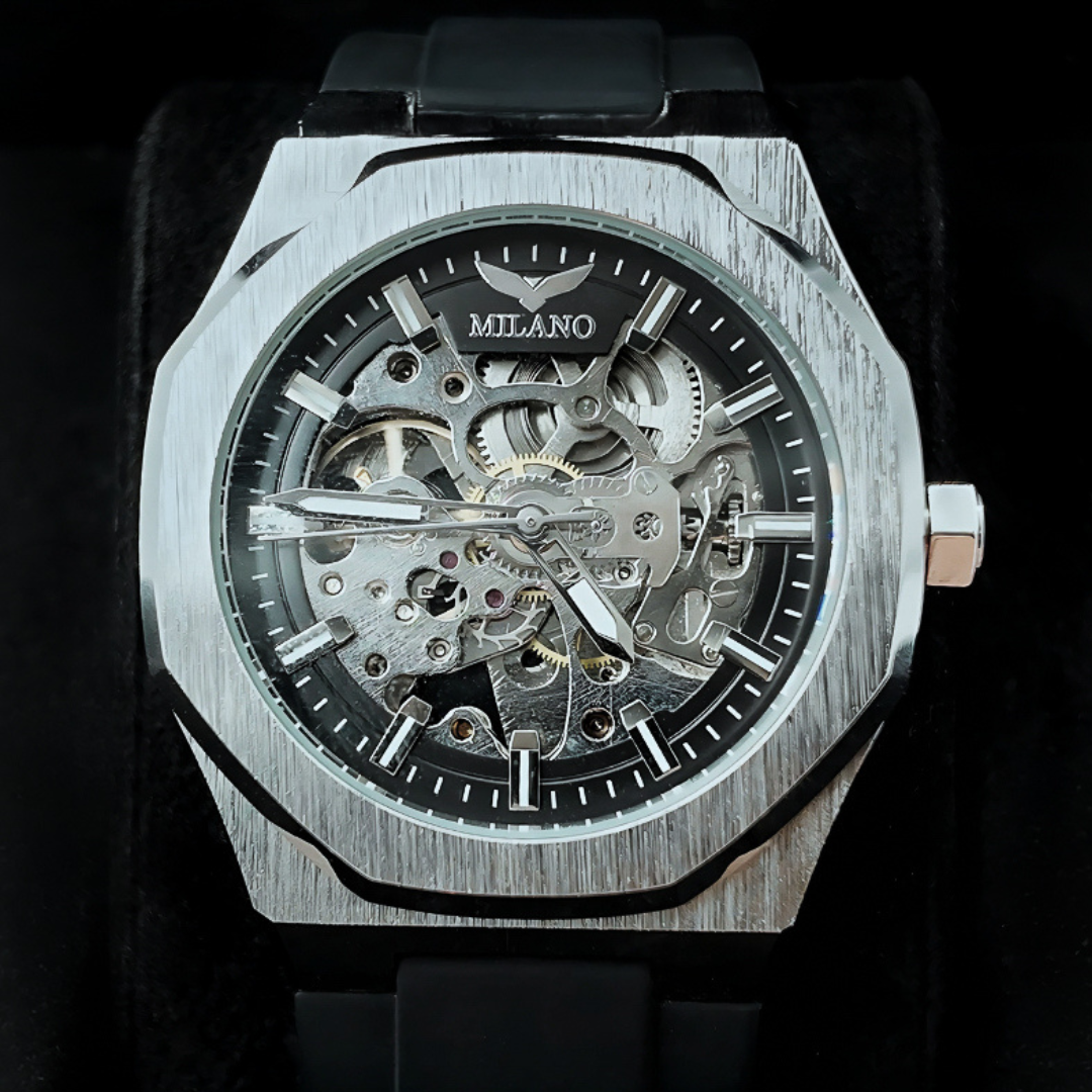 O Milano Automatic S1227 combina design Skeleton e Exhibition Caseback, revelando a sofisticação e a vida pulsante do movimento mecânico.